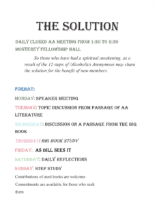 The Solution is a new closed meeting of Alcoholics Anonymous held daily at 1:30 PM in the Fellowship Hall. This meeting is intended for those who have had a spiritual awakening as the result of working the Twelve Steps and who wish to share the solution with newer members. Please see the flyer below for additional details.