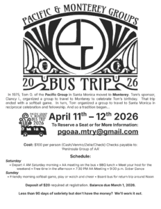 At our recent District meetings, we began discussing the possibility of using a District Instagram account as a tool to help reach more suffering alcoholics. The conversation is ongoing, and we will keep you informed as it develops. In addition, General Service District 01 will be hosting the Birthday Speaker Meeting on March 28th at Monterey High School. Please come celebrate your sobriety birthday with us—there will be delicious cakes and an inspiring speaker to make the evening special.