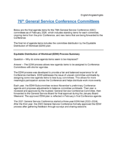 This is Elena B., DCMC, District 01, and I’m happy to share some important highlights with you this month. First and foremost, the Final Agenda Topics—those that Delegates will discuss at the annual General Service Conference—are now available. Please review the attached agenda, as your GSRs will soon be scheduling time with you to gather an informed group conscience on the items your group is most interested in. If your group does not currently have a GSR, please consider electing one as soon as possible so your group’s voice can be heard when important decisions are made that affect AA as a whole.