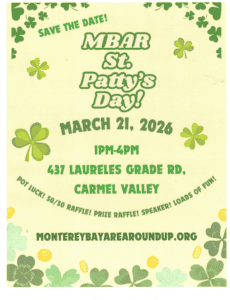 Please see the flyer below for details on the upcoming St. Patty’s Day potluck and speaker meeting to raise funds for MBAR.