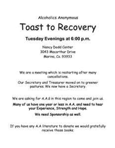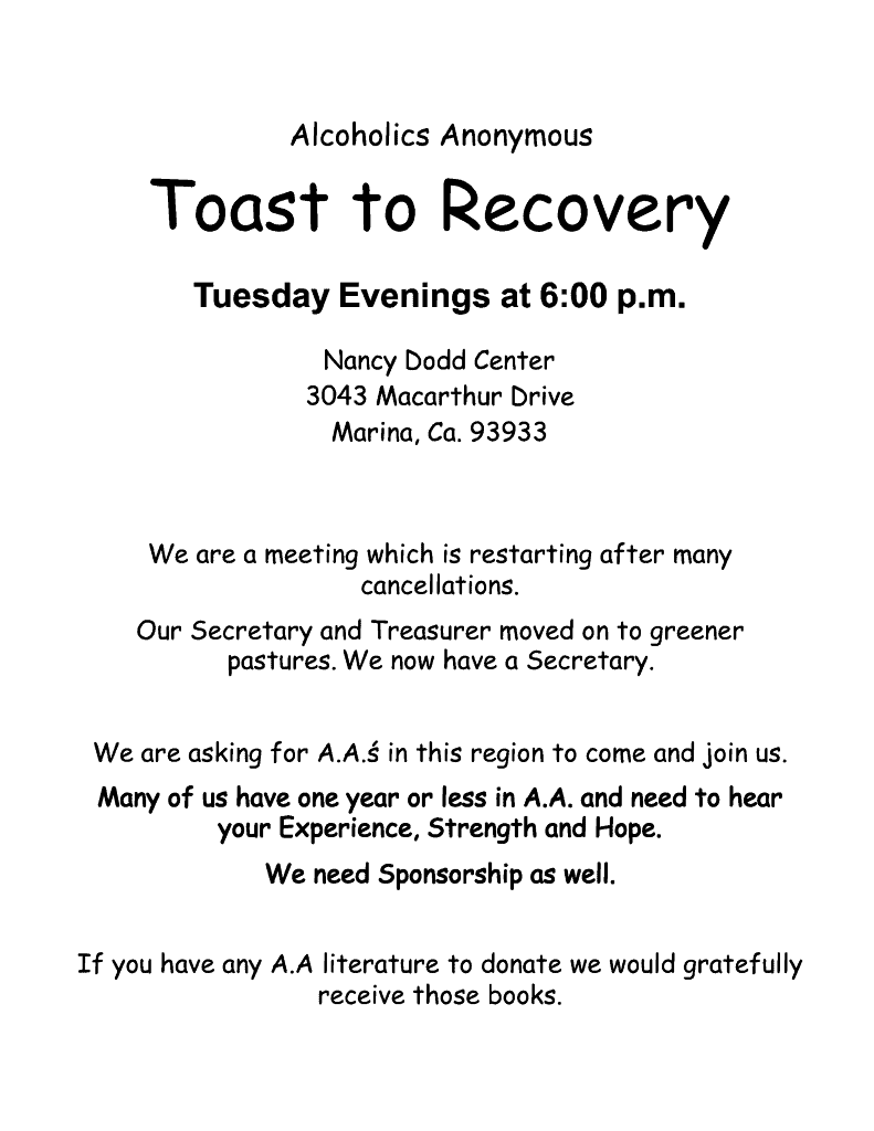 Toast to Recovery (Tuesdays at 6:00 PM at the Nancy Dodd Center in Marina) is asking for the Fellowship’s support. Many members have less than a year of sobriety and would greatly benefit from your Experience, Strength, and Hope. Please see the flyer below for more information.