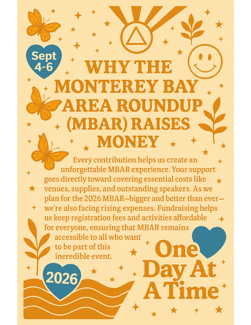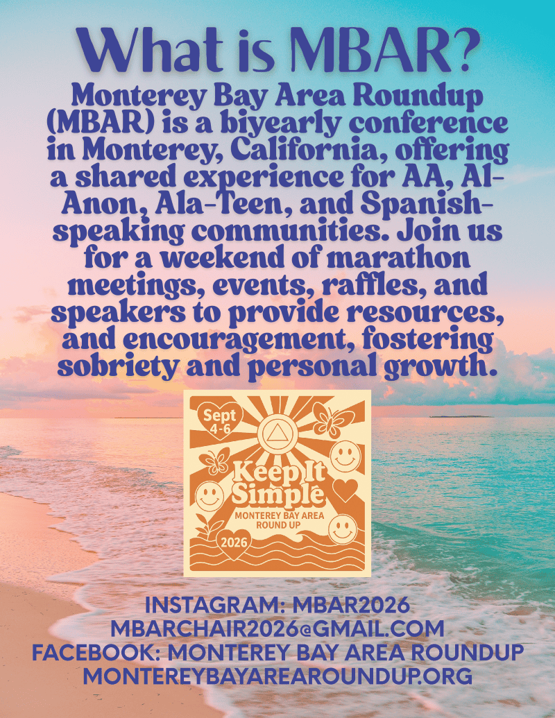 The Monterey Bay Area Roundup (MBAR) is a biennial conference held in beautiful Monterey, California. It brings together the AA, Al-Anon, Ala-Teen, and Spanish-speaking communities for a powerful weekend of shared experience, encouragement, and growth.